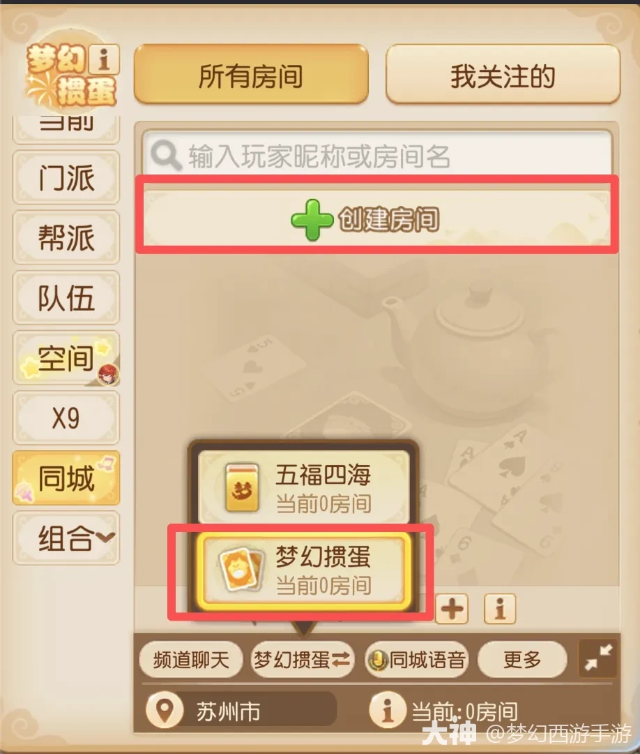 少侠也可以点击同城频道,点击同城玩法,快速创建房间: