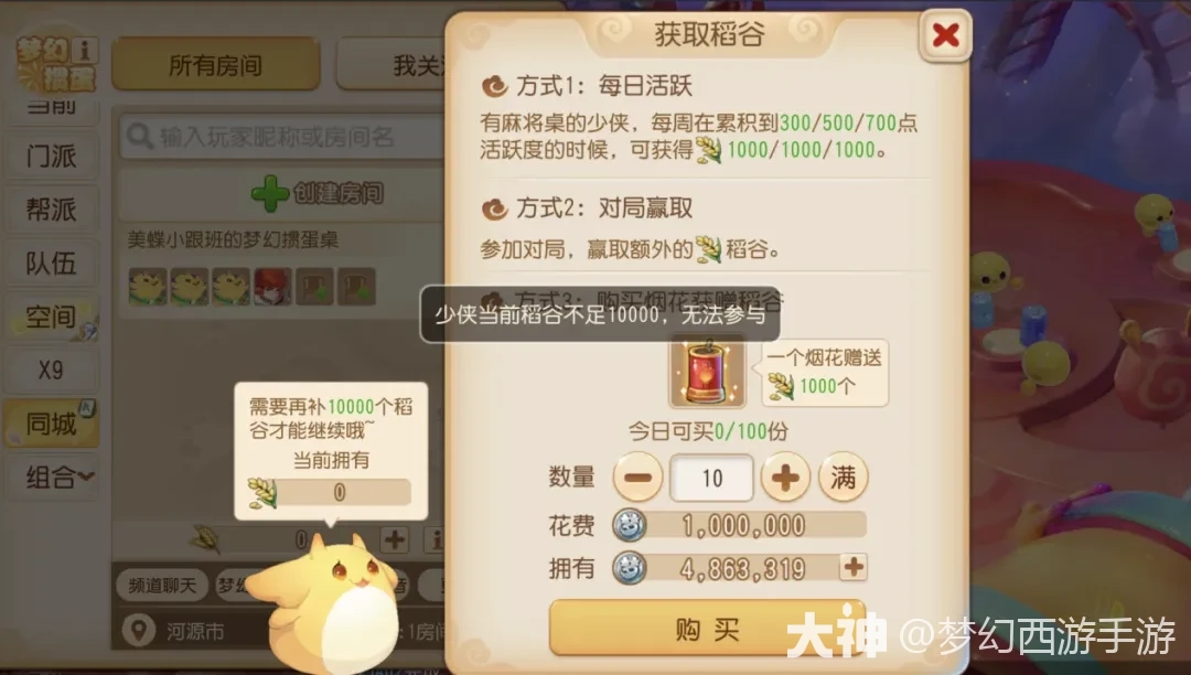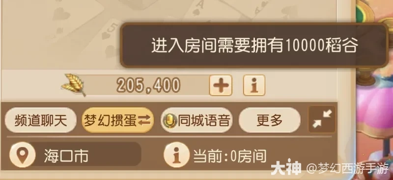 进入房间需要10000稻谷,稻谷少于10000无法参与。