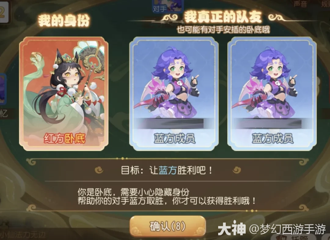 你是卧底,你需要和你的卧底队友共同取胜!少侠要注意隐藏自己的身份并让队伍获得第一名哦~