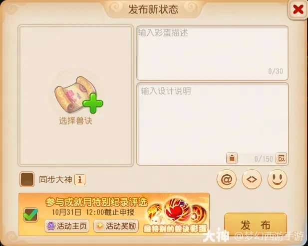 本期特别成就主题为“最特别的兽诀彩蛋”,各位少侠在成就月活动页面点击右上角“发布纪录”,选好兽诀、输入彩蛋描述和设计说明后发布即可参选。