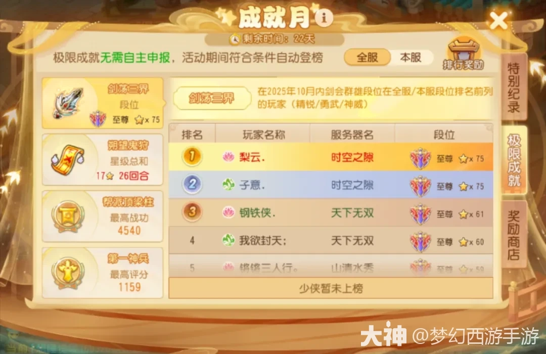 该成就正常参与剑会群雄活动,在2025年10月内前抓紧时间上分,积累胜场即可,期间获得的最高段位会被自动记录下来。