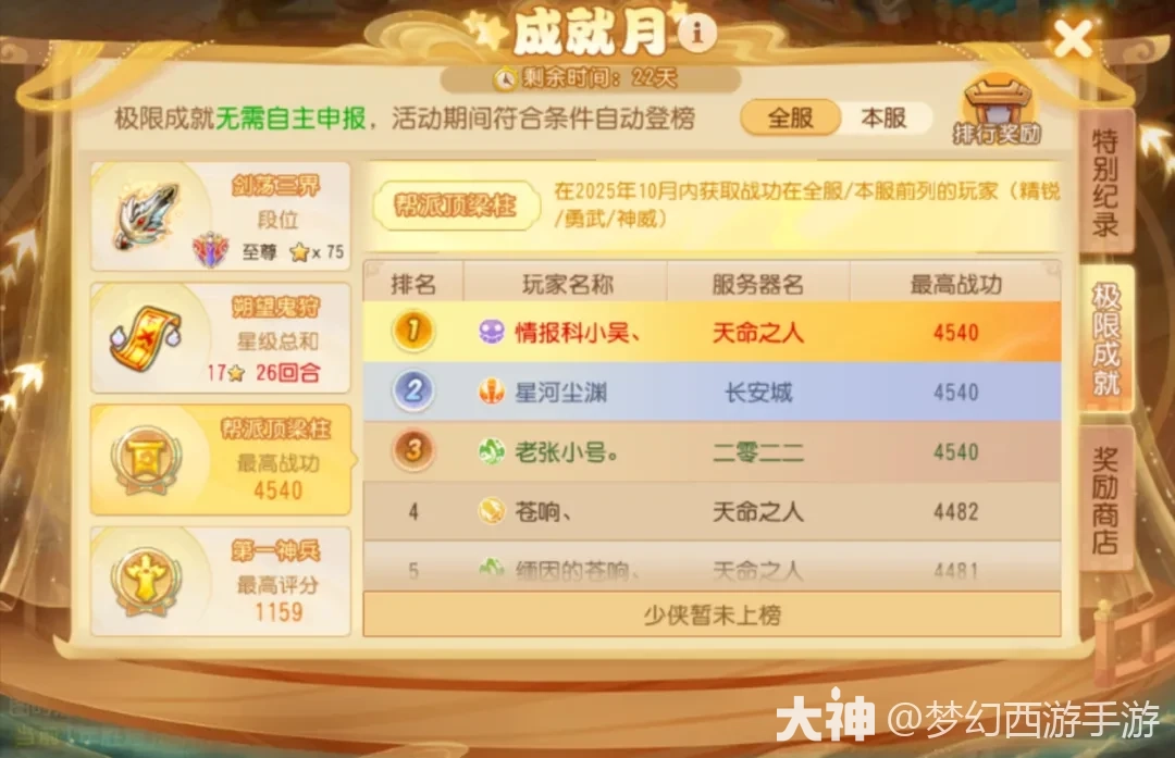 在2025年10月内获取战功会被记录,自动纳入排行。各位少侠要多多参与帮战,尽可能多地获取战功哦。