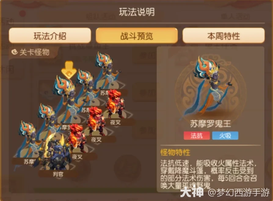例如本周鬼王种类为苏摩罗鬼王,能吸收火属性法术并且有较高的法术抗性,因此配置召唤灵时建议选择攻宠来将其击杀。
