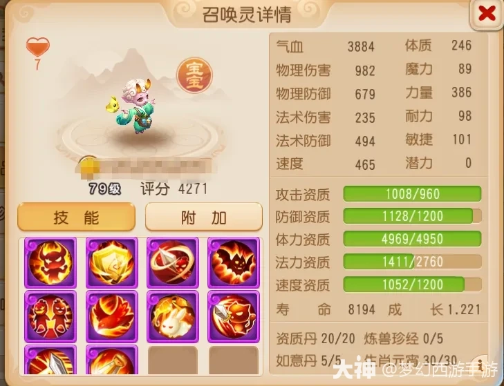 这只善恶忘川童子除了携带增加伤害结果的高级先发外,还有增强生存能力的高级防御、高级吸血、高级反击技能,高级敏捷增加出手速度。