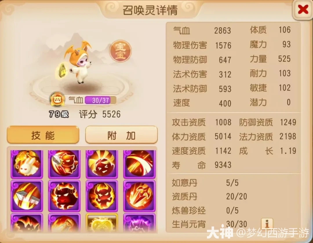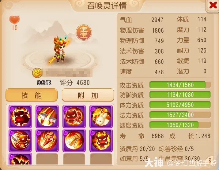 这只猴小仙携带了高级神佑复生、高级强壮增加生存能力;高级必杀及高级偷袭增加输出;高级连击、高级协力、高级强力负责增加伤害;高级吸血技能配合猴小仙专属内丹“大圣佑”,更是可以在1血不死的情况下出手回复至满状态!给猴小仙留住一丝血量,就是给了它绝地翻盘的机会,毕竟血量越低,伤害越爆炸!