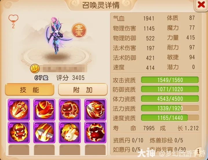 虽然它的攻击资质虽然稍低,但体力资质及防御资质都极为优秀,在战斗后期可以对配速召唤灵造成不俗伤害,同时忘川童子专属套装的返场效果更有奇效!