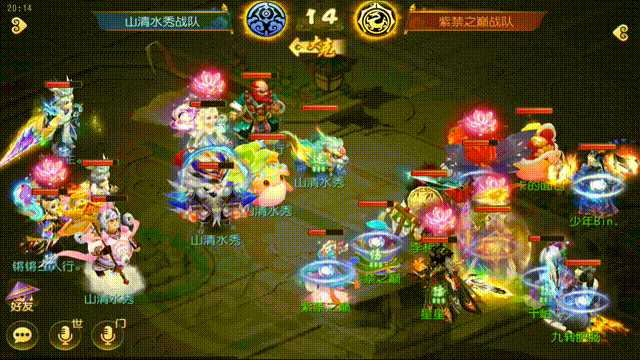 第14回合,紫禁之巅战队普陀晶清保证狮驼出手,在失心降防后,狮驼岭连环击出手成功击倒山清水秀战队的方寸。