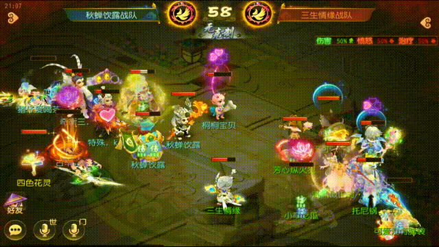 第57回合双方更是剑拔弩张,观战方普陀补出芙蓉仙子,触发芙蓉仙子解封并抗封加成状态,狮驼岭鹰击出手拿下三杀;对战方小雷音也一念成佛出手成功击杀女儿村及龙宫,双方各倒地两人。