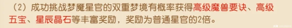 挑战成功后,不仅有概率获得普通星官2倍的奖励(包括高级魔兽要诀、法宝精华、星辰晶石等珍稀道具),此外在全服放出后首通双生·梦魇星官的队伍还将解锁首通成就,记录在服务器的荣耀史册中哦~