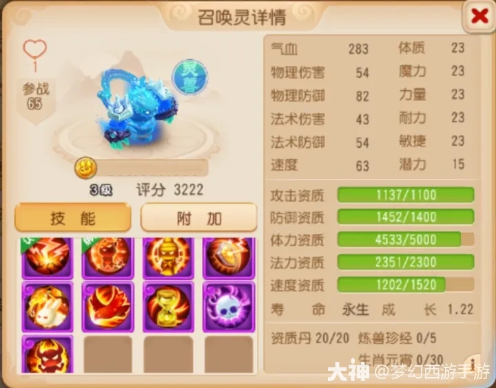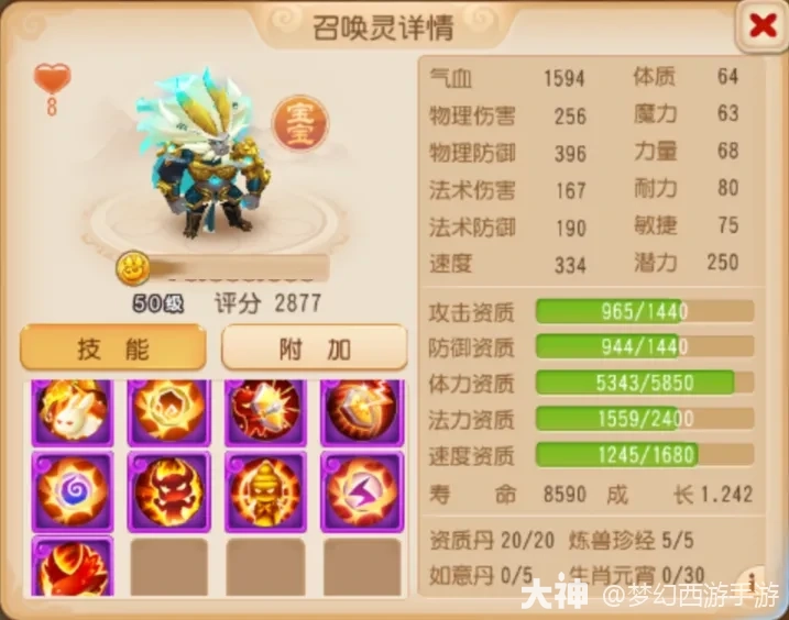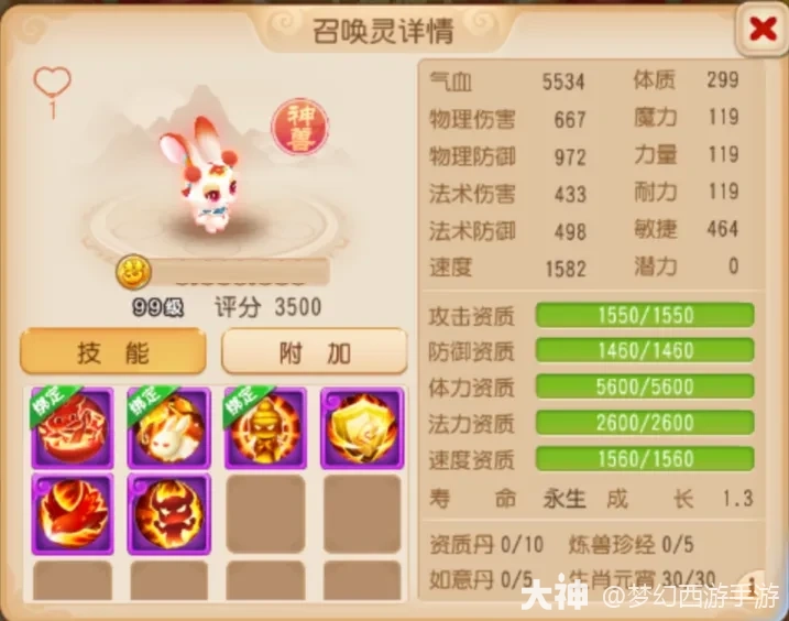 这只嘲风在高级土属性吸收、高级水属性吸收、高级雷属性吸收以及嘲讽的基础上还携带“法术防御”,不亚于给钢板再加一件防弹背心,遇到这样的召唤灵想必敌方也束手无策了。