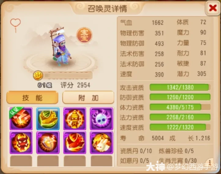这只“死亡召唤”水灵兽携带“法术防御”后,完全是进可攻退可守,若是处于优势中,他定能助少侠一举锁杀对手,走向胜利;若是处于劣势中,他超强的防御能力定能协助少侠运营战局,静待时机,逆风翻盘~