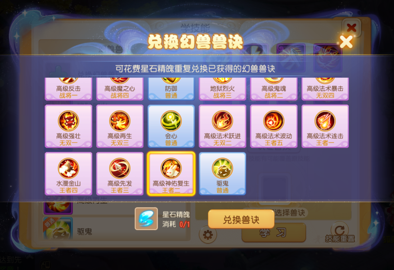 当缺少特定兽诀时,玩家可在兽诀商店消耗1个星石精魄指定兑换。如果对幻兽打书结果不满意或是需要做出调整,也可消耗精魄重置幻兽技能,已经掉落的兽诀也将全部重置。